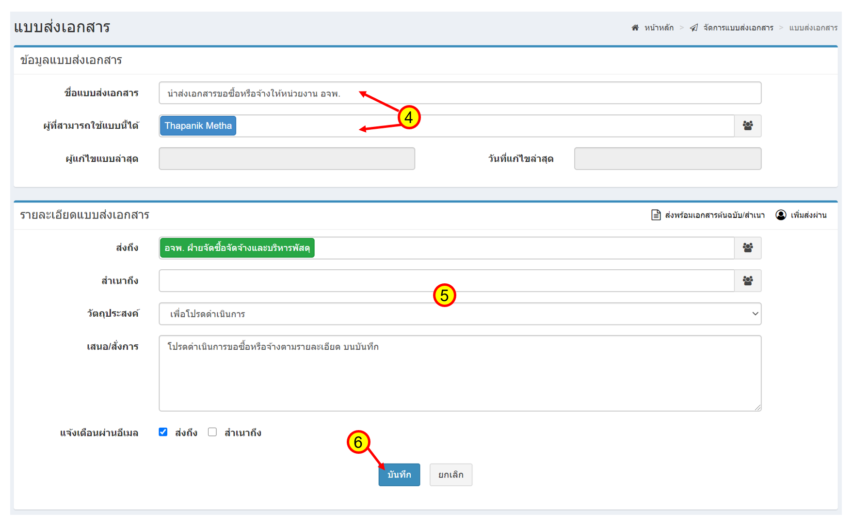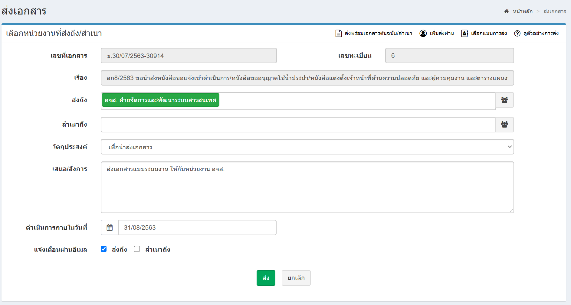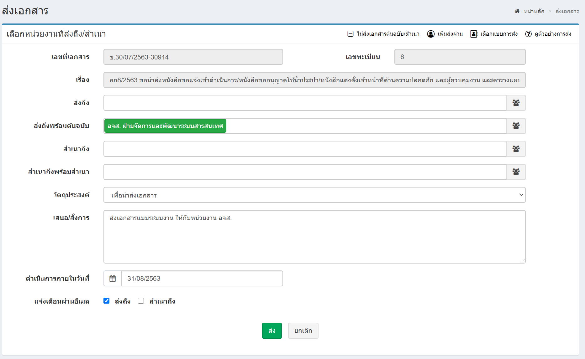 - กำหนดรายละเอียดแบบส่งเอกสาร ได้แก่ ส่งถึง ส่งถึงพร้อมต้นฉบับ สำเนาถึง สำเนาถึงพร้อมสำเนา ส่งผ่าน วัตถุประสงค์ของการส่งงาน การเสนอ/สั่งการ และการแจ้งเตือนอีเมล