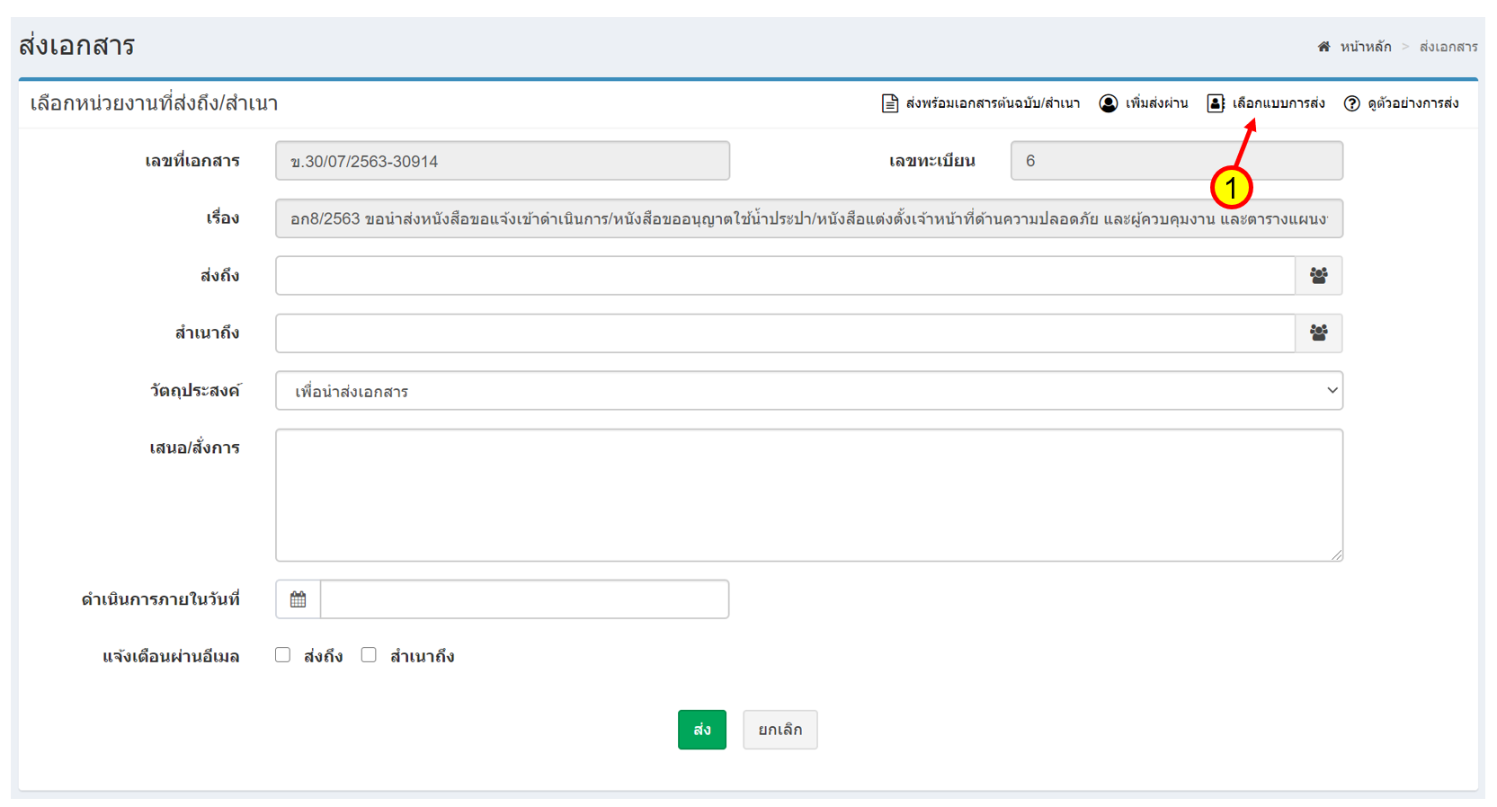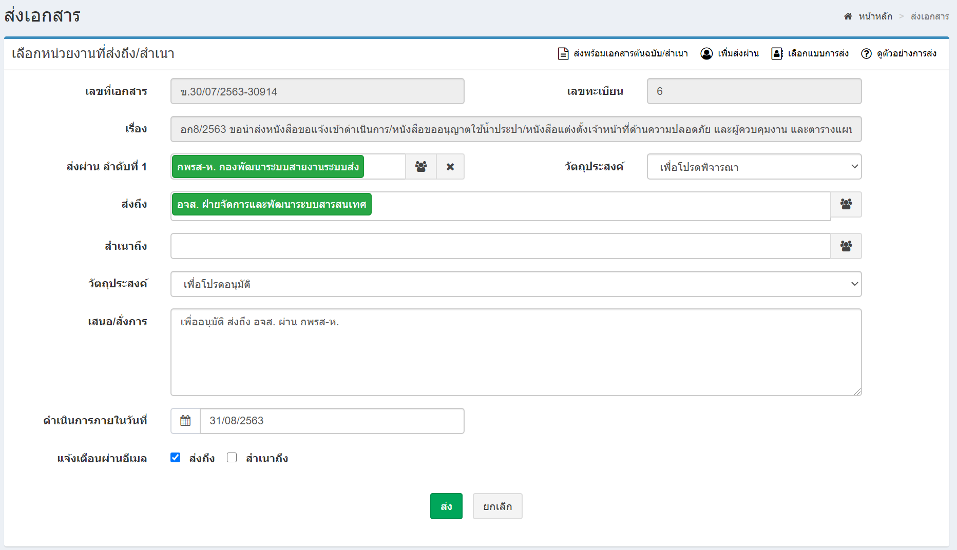 - ระบบจะระบุข้อมูลการส่งให้อัตโนมัติ ตามแบบส่งเอกสารที่กำหนดไว้