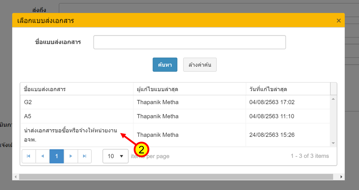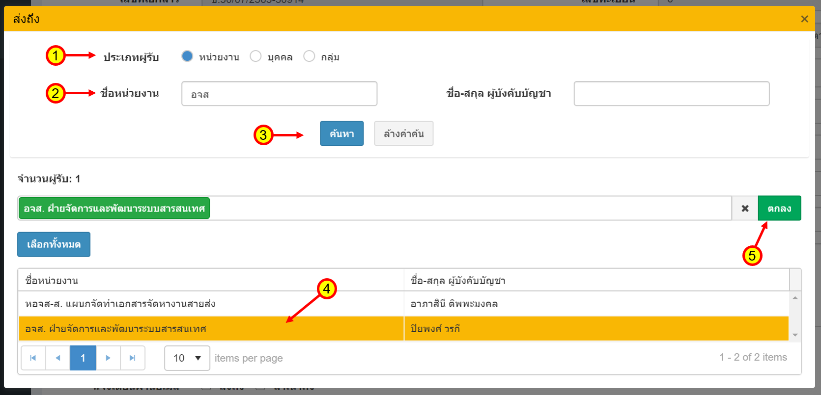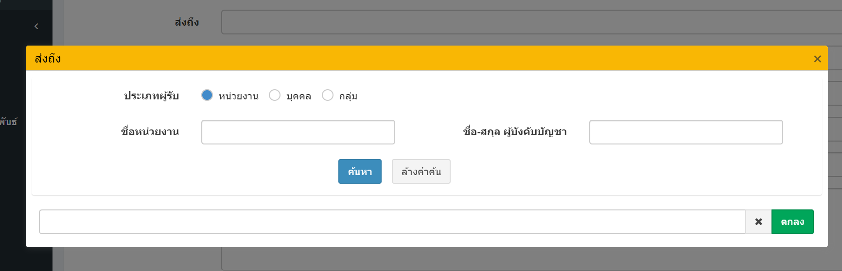 เมื่อเลือก ส่งถึง ส่งถึงพร้อมต้นฉบับ สำเนาถึง หรือ สำเนาถึงพร้อมสำเนา ระบบจะแสดงหน้าต่างเพื่อค้นหาผู้รับเอกสาร
