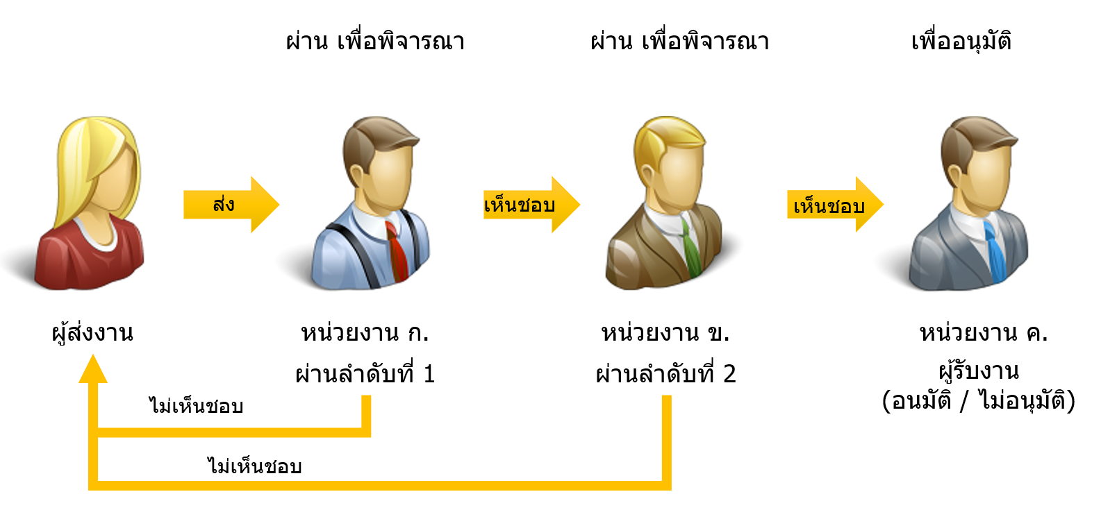 ตัวอย่างการใช้งาน เช่น ผู้ใช้งานสามารถเลือกส่ง ผ่านหน่วยงาน ก. เพื่อเห็นชอบ ผ่านหน่วยงาน ข. เพื่อเห็นชอบ และถึงหน่วยงาน ค. เพื่ออนุมัติ โดยจะมีภาพ workflow ดังต่อไปนี้