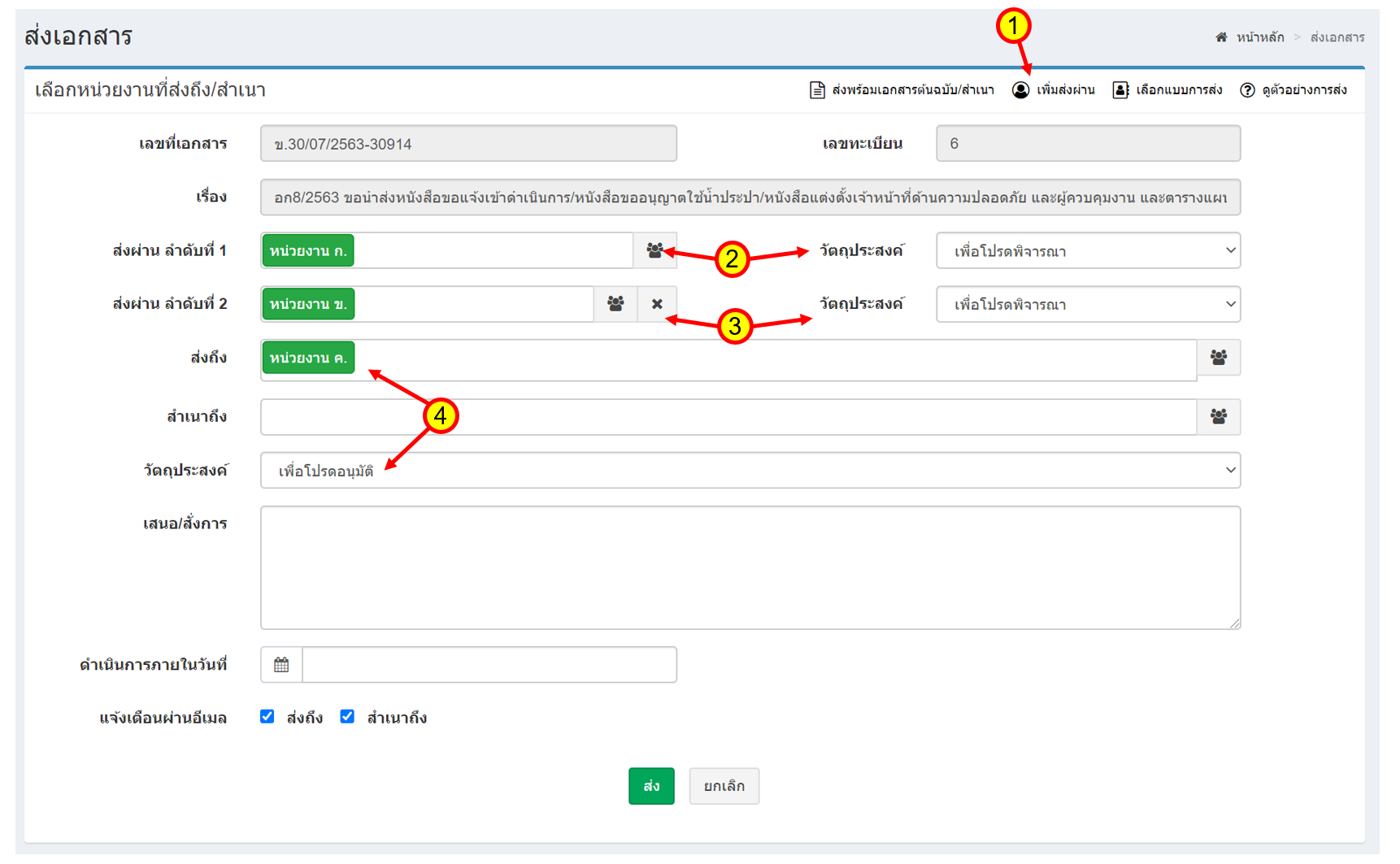 - ระบุหน่วยงาน ข. และระบุวัตถุประสงค์ของการส่งเอกสาร ผ่านหน่วยงาน ข.